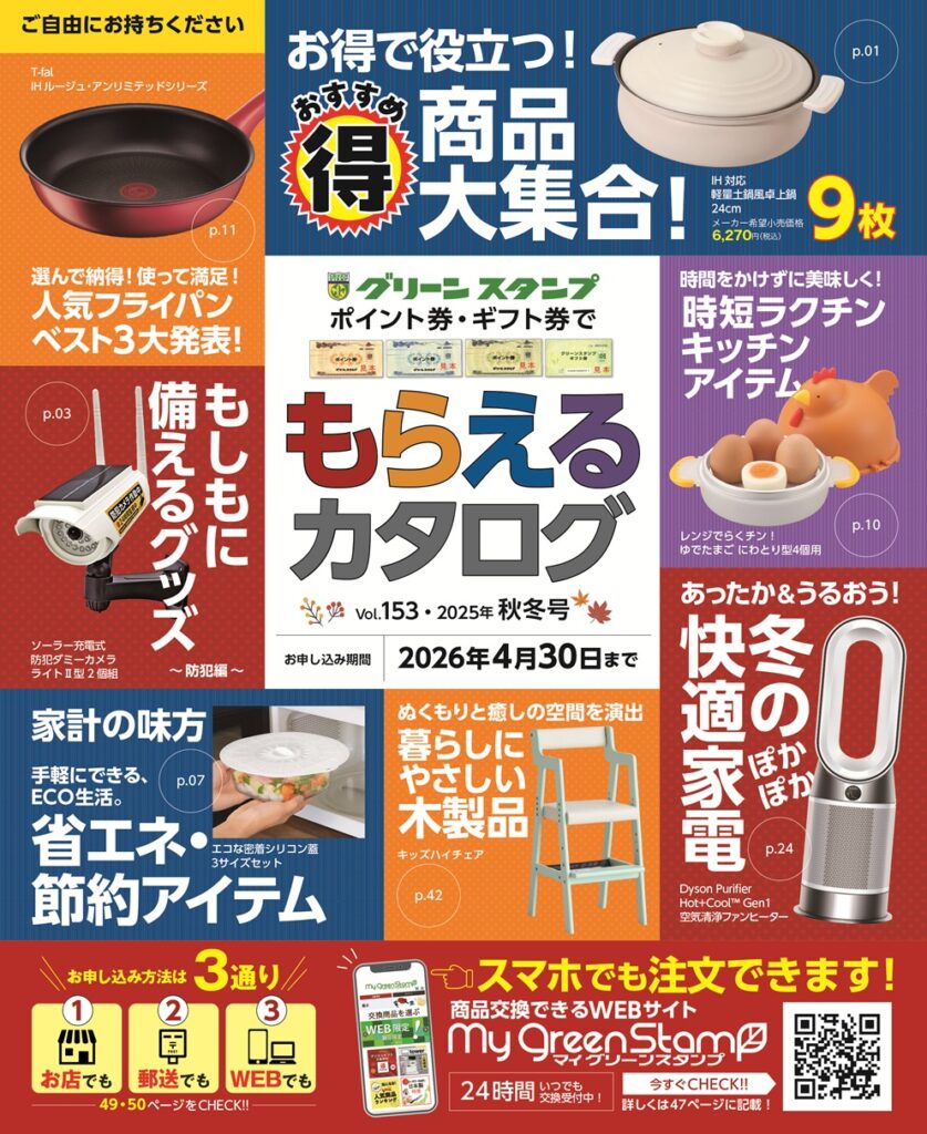 やおふくポイントカード会員様へ★2025年秋冬号グリーンスタンプ商品カタログ発行しました。 2025年10月13日 お待たせしました!グリーンスタンプギフト券でもらえるカタログVol.153.2025年秋冬号が発行されました。やおふく各店舗のレジサービスカウンターやサッカー台に設置中です。ご希望のやおふくポイントカード会員様はご自由にお持ちください。