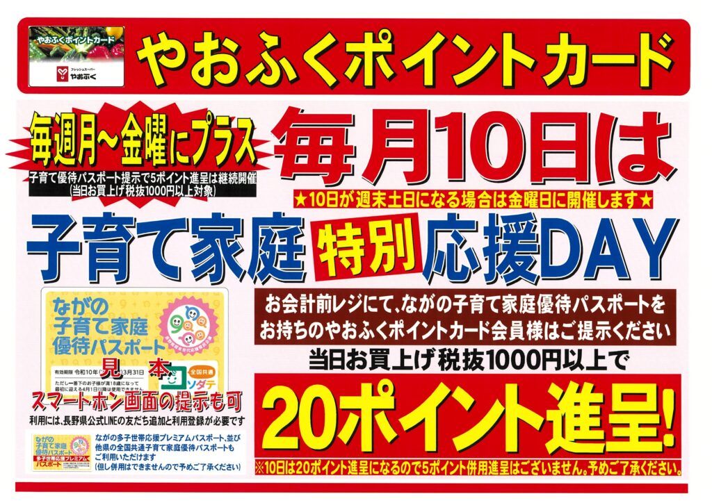 やおふくポイントカード新企画★毎月10日は子育て家庭特別応援DAY。20ポイントを進呈! 2026年2月9日 月曜から金曜迄の子育て家庭応援DAYにプラス、毎月10日は特別応援DAY!お会計時「ながの子育て家庭優待パスポート」をお持ちのやおふくポイントカード会員様はレジにてご提示くだい。当日お買上げ税抜1000円以上で20ポイントを進呈いたします。 ★お願い:10日が週末土日なる場合は金曜日に開催いたします。また、10日は特別20ポイント進呈になるため5ポイント併用進呈はございません。予めご了承ください。