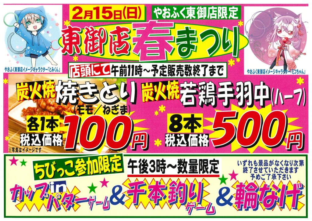 2月15日(日)は東御店限定「春まつり」開催いたします! 2026年2月9日 当日は午前11時より、美味しい焼きたての焼き鳥や手羽中ハーフを数量限定にて販売致します。又、午後3時からは小学生以下のお子様限定参加のゲームを行います。2/15(日)はご家族の皆様でやおふく東御店にご来店下さい。