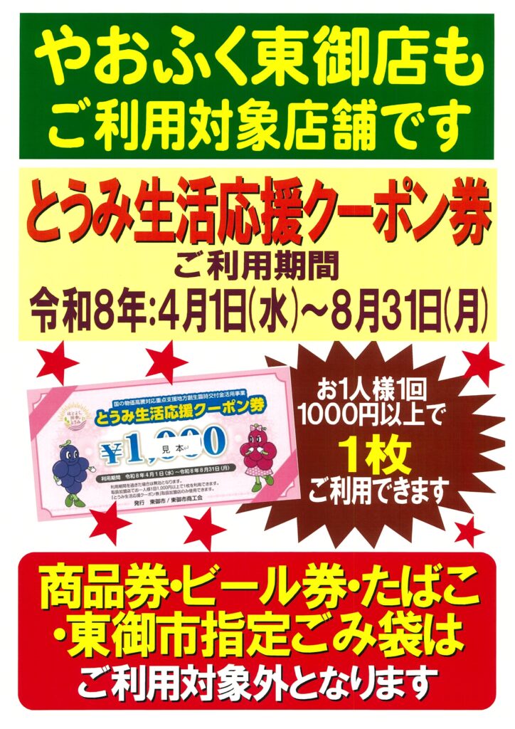 やおふく東御店は「とうみ生活応援クーポン券」ご利用対象店舗です 2026年4月4日 ご利用期間は令和8年8月31日(月)迄。商品券・たばこ・東御市指定ごみ袋のご購入はクーポン券ご利用対象外となりますので予めご了承ください。