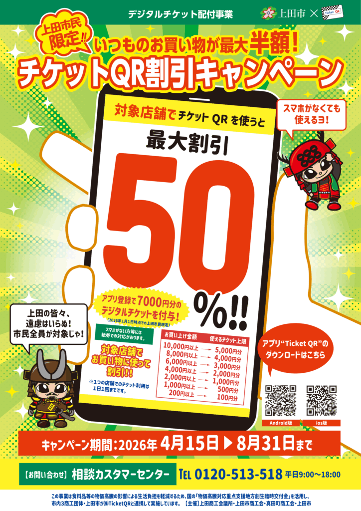 上田市チケットQR割引キャンペーン★やおふく秋和店・塩田店・古里店がご利用対象店です! 2026年4月15日 キャンペーン期間は2026年4月15日(水)~8月31日(月)迄。上田市指定ごみ袋や商品券・ビール券などの金券や、たばこの購入はご利用対象外となりますので予めご了承ください。
